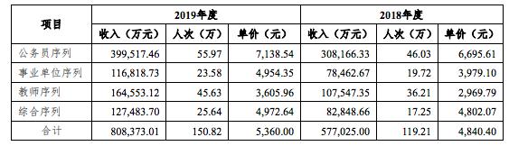 關(guān)于培訓(xùn)收入增幅顯著高于培訓(xùn)人次增幅的合理性,中公回復(fù)稱,2019 年度面授培訓(xùn)收入增長(zhǎng) 40.09%,培訓(xùn)人次增長(zhǎng) 26.51%,培訓(xùn)單價(jià)增長(zhǎng)10.73%,培訓(xùn)收入增幅明顯高于培訓(xùn)人次增幅,主要系受各培訓(xùn)序列產(chǎn)品價(jià)格提升及結(jié)構(gòu)變化共同影響。