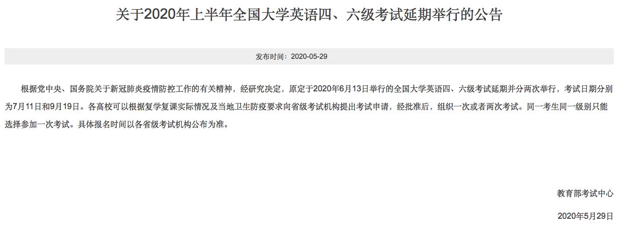 多知網(wǎng)5月29日消息,教育部發(fā)布公告表示,原定于2020年6月13日舉行的全國(guó)大學(xué)英語(yǔ)四、六級(jí)考試延期并分兩次舉行,考試日期分別為7月11日和9月19日。
