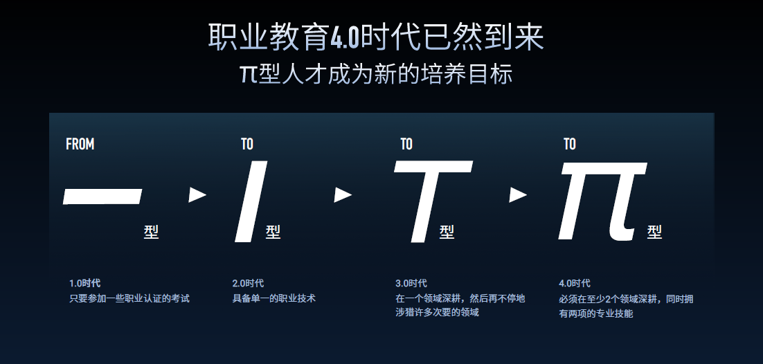 孫瑩認(rèn)為,職業(yè)教育1.0和2.0時(shí)代,主要注重的是某一專業(yè)領(lǐng)域的知識(shí)或技能的學(xué)習(xí)。到了3.0時(shí)代,我們培養(yǎng)的是T型人才。“T”中的“—”表示廣博的知識(shí)面,“|”表示專業(yè)的深度。在“寬知識(shí)、深專業(yè)”的基礎(chǔ)上,形成硬能力“尖角”打造一專多能人才。 職業(yè)教育4.0時(shí)代開啟,“π型人才”成為新培養(yǎng)目標(biāo)。