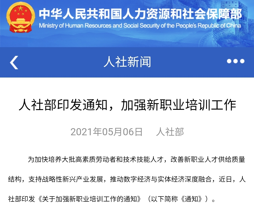 多知網(wǎng)5月7日消息,近日,人力資源和社會保障部印發(fā)《關于加強新職業(yè)培訓工作的通知》(以下簡稱《通知》)。旨在加快培養(yǎng)大批高素質(zhì)勞動者和技術技能人才,改善新職業(yè)人才供給質(zhì)量結構,推動數(shù)字經(jīng)濟與實體經(jīng)濟深度融合。