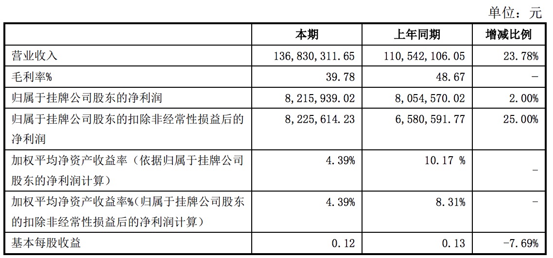 報(bào)告顯示,營業(yè)收入1.37億元,同比增長23.78%;歸屬于掛牌公司股東的凈利潤821.59萬元,同比增長2%;歸屬于掛牌公司股東的扣除非經(jīng)常性損益后的凈利潤822.56萬元,同比增長25%。