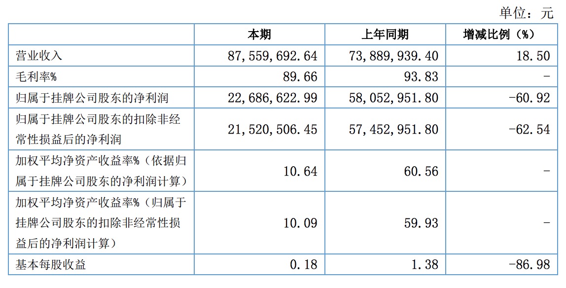 報告顯示,2016年上半年營業(yè)收入8760萬元,同比增長18.5%;歸屬于掛牌公司股東的凈利潤2269萬元,同比下降60.92%。