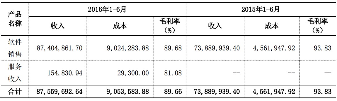 如表所示,公司的主營業(yè)務(wù)收入包括軟件銷售收入和服務(wù)收入。其中,軟件銷售收入8740萬元,同比增長15%;軟件銷售成本902.42萬元,同比增長49%;軟件銷售毛利率89.68%,同比下降4%。