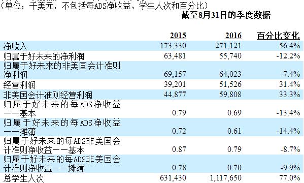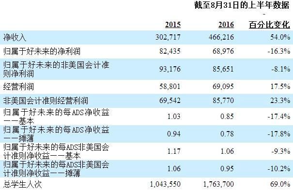 財報顯示,好未來2017財年Q2總營收2.71億美元,同比增長56.4%,凈利潤5574萬美元,同比下降12.2%;2017財年上半年總營收4.66億美元,同比增長54.0%;凈利潤6898萬美元,同比下降16.3%。