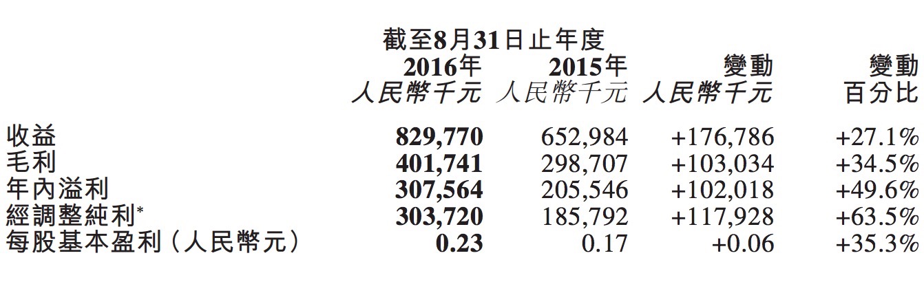 多知網(wǎng)12月1日消息,近日,楓葉教育發(fā)布截至2016年8月31日止年度業(yè)績,報告顯示,楓葉教育總營收8.3億元,同比增長27.1%;凈利潤3.07億元,同比增長49.6%;經(jīng)調(diào)整純利3.04億元,同比增長63.5%;毛利4.02億元,同比增長34.5%。
