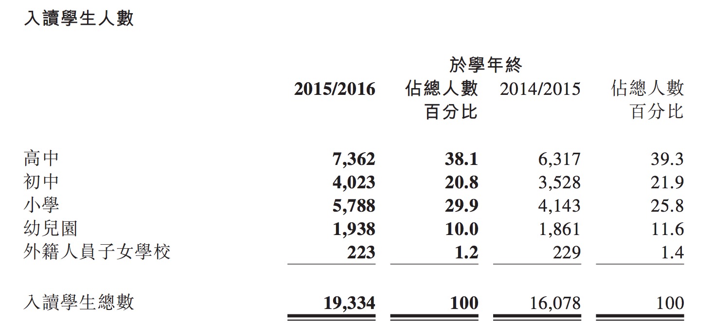 報告期內(nèi),楓葉教育2015/2016學(xué)年入讀學(xué)生人數(shù)為19334人,相比較2014/2015學(xué)年增加了3256人,超過五年計劃下制定的2015/2016學(xué)年入讀阻塞目標約6%。其中,高中人數(shù)7362人,占總?cè)藬?shù)的38.1%;小學(xué)人數(shù)5788人,占總?cè)藬?shù)29.9%;初中人數(shù)4023人,占總?cè)藬?shù)20.8%。