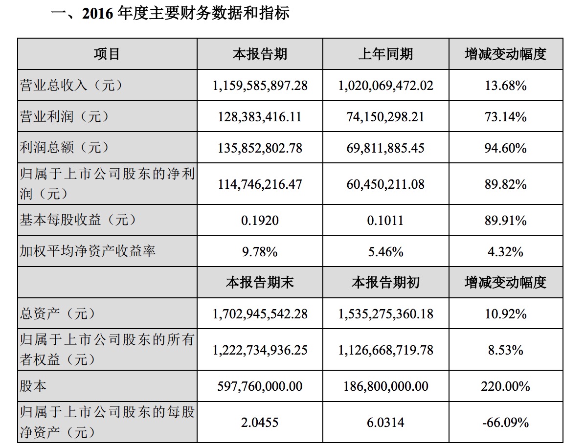 報(bào)告顯示,2016 年度公司營(yíng)業(yè)收入為 11.60億元,較上年同期增長(zhǎng) 13.68%;營(yíng)業(yè)利潤(rùn)為1.28億元,較上年同期增長(zhǎng)73.14%;利潤(rùn)總額為1.36億元,較上年同期增長(zhǎng)94.60%;歸屬于上市公司股東的凈利潤(rùn)為1.15億元,較上年同期增長(zhǎng)89.82%。