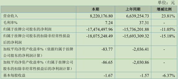 2016財年歸屬于掛牌公司股東的凈利潤為-1747.45萬元,去年同期為-1573.62萬元,同比增長-11.05%;