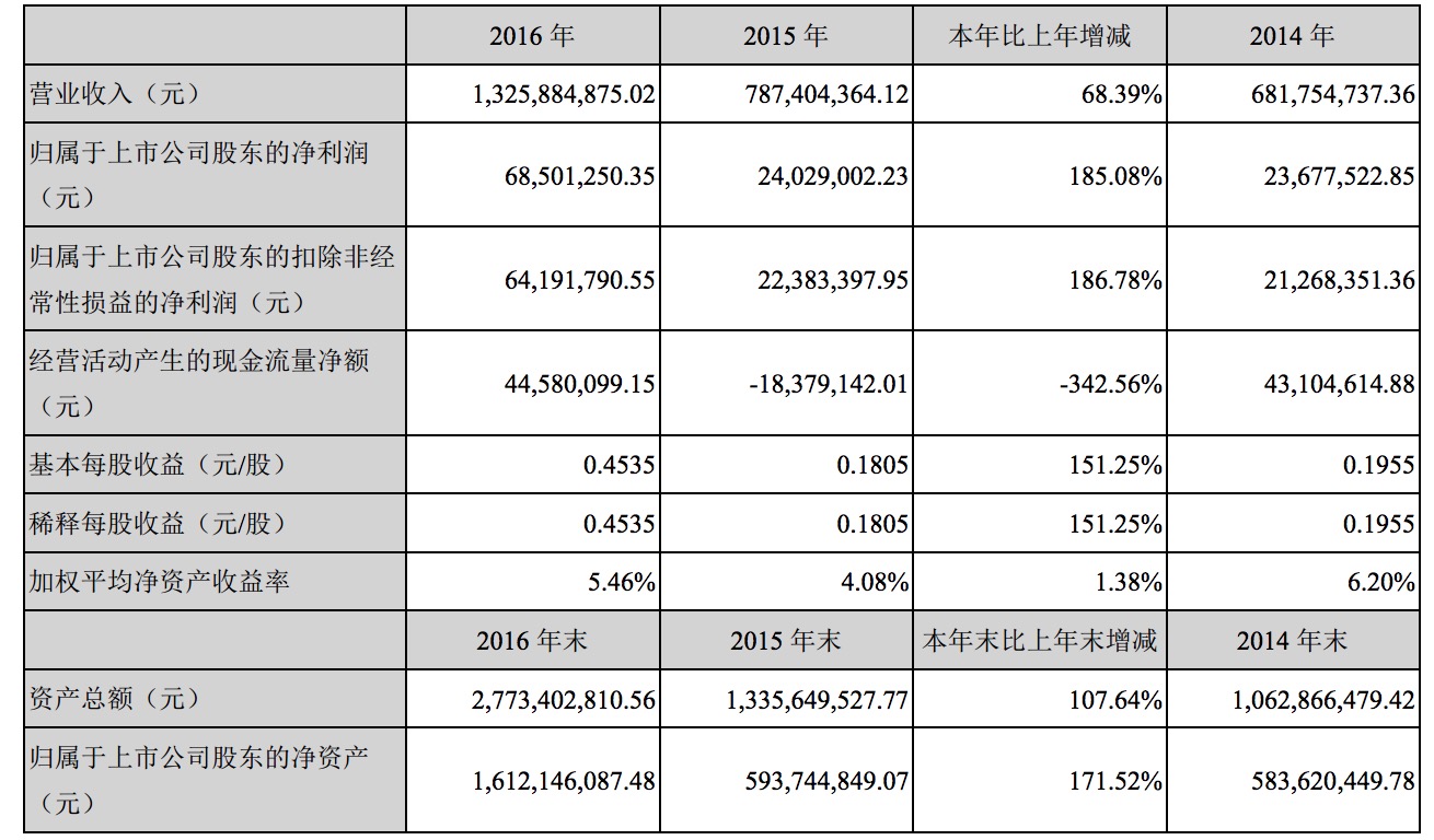 報告顯示,和晶科技2016年營收為13.26億元,比2015年的7.87億增長68.39%;凈利潤為6850.13萬元,比2015年的2402.90萬元增長185.08%;總資產(chǎn)為27.73億元,比2015年的13.36億元增長107.64%。