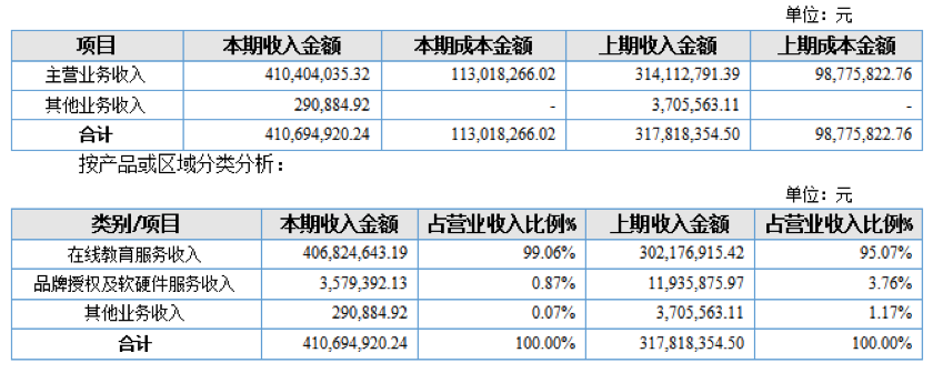 報告披露,在線教育服務(wù)收入4.06億元,占比99.06%,同比增長 34.63%,品牌授權(quán)及軟硬件服務(wù)收入357.94 萬元,占比0.87%,同比下降 70.01%。