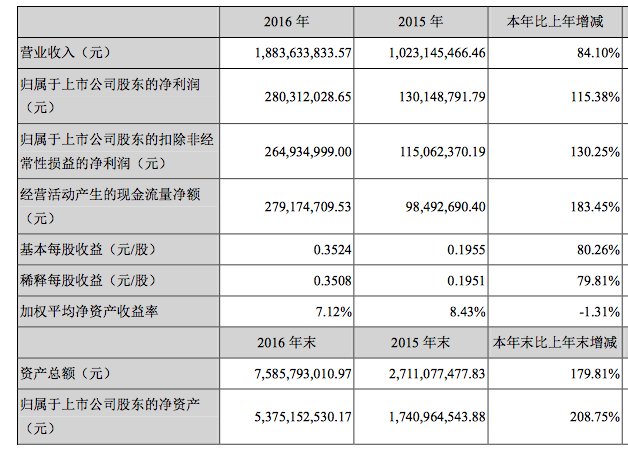 ?多知網(wǎng)4月26日消息,昨日立思辰發(fā)布2016年度財(cái)報(bào)。財(cái)報(bào)顯示,2016年凈利潤(rùn)2.80億元,比去年的1.30億元增長(zhǎng)115.38%;營(yíng)收18.84億元,比去年的10.23億元增長(zhǎng)84.10%,其中教育業(yè)務(wù)實(shí)現(xiàn)營(yíng)收9.92億元;基本每股收益為0.3524元,比去年的0.1955元增長(zhǎng)80.26%;稀釋每股收益為0.3508元,比去年的0.1951元增長(zhǎng)79.81%。主要數(shù)據(jù)如下圖: