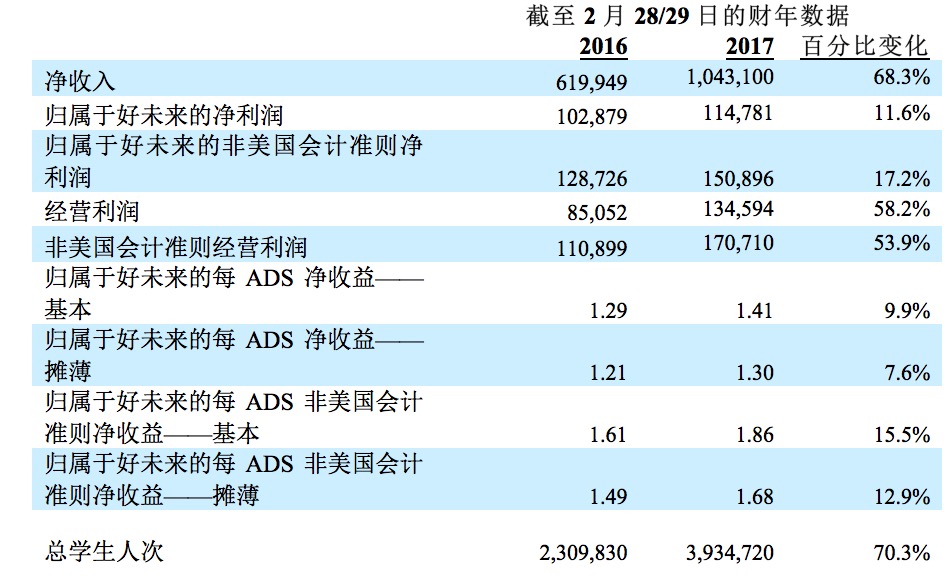 總學(xué)生人次從2016財(cái)年的約230.98萬(wàn)名增長(zhǎng)到2017財(cái)年的約393.47萬(wàn)名,同比增長(zhǎng)70.3%。