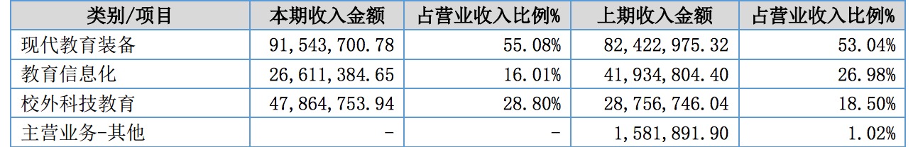 其中,現(xiàn)代教育裝備收入9154.37萬(wàn)元,占營(yíng)收55.08%;校外科技教育收入4786.48萬(wàn)元,占營(yíng)收28.80%;教育信息化收入2661.14萬(wàn)元,占營(yíng)收16.01%。
