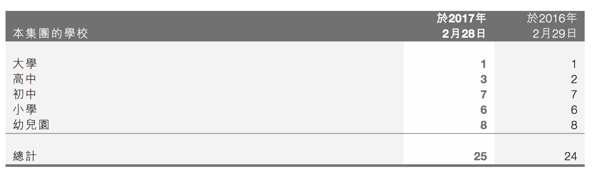 報(bào)告期內(nèi),宇華教育在中國河南省有25所學(xué)校,按類別劃分如下: