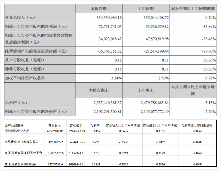 報(bào)告期內(nèi),世紀(jì)鼎利教育業(yè)務(wù)營(yíng)收1.41億元。其中,IT職業(yè)教育及實(shí)訓(xùn)系統(tǒng)平臺(tái)營(yíng)收1.08億元,同比增長(zhǎng)22.49%,毛利率為52.36%;IT職業(yè)教育及實(shí)訓(xùn)服務(wù)營(yíng)收3270.85萬(wàn)元,同比增長(zhǎng)18.62%,毛利率為38.52%。
