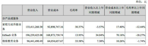 家?;由墭I(yè)務實現(xiàn)營收1.33億元,同比下降3.57%;繼續(xù)教育業(yè)務實現(xiàn)營收9644.15萬元,同比增長7.38%;EdSaaS業(yè)務實現(xiàn)營收1.96億元,同比增長34.04%。