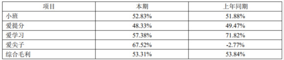 愛學(xué)習(xí)“雙師課堂”和“西點師院”模式正處于試點推廣期,成本較高,造成本期毛利低于上年同期。