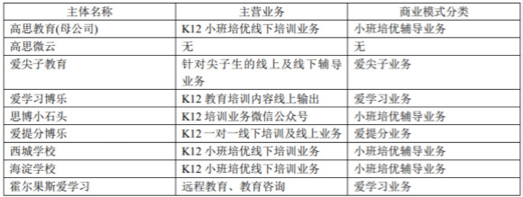 公司的商業(yè)模式主要分為四類:小班培優(yōu)業(yè)務(wù)、愛學(xué)習(xí)業(yè)務(wù)、愛提分業(yè)務(wù)、愛尖子業(yè)務(wù),公司及各子公司、培訓(xùn)學(xué)校的主營業(yè)務(wù)及商業(yè)模式分類的簡要情況如下: