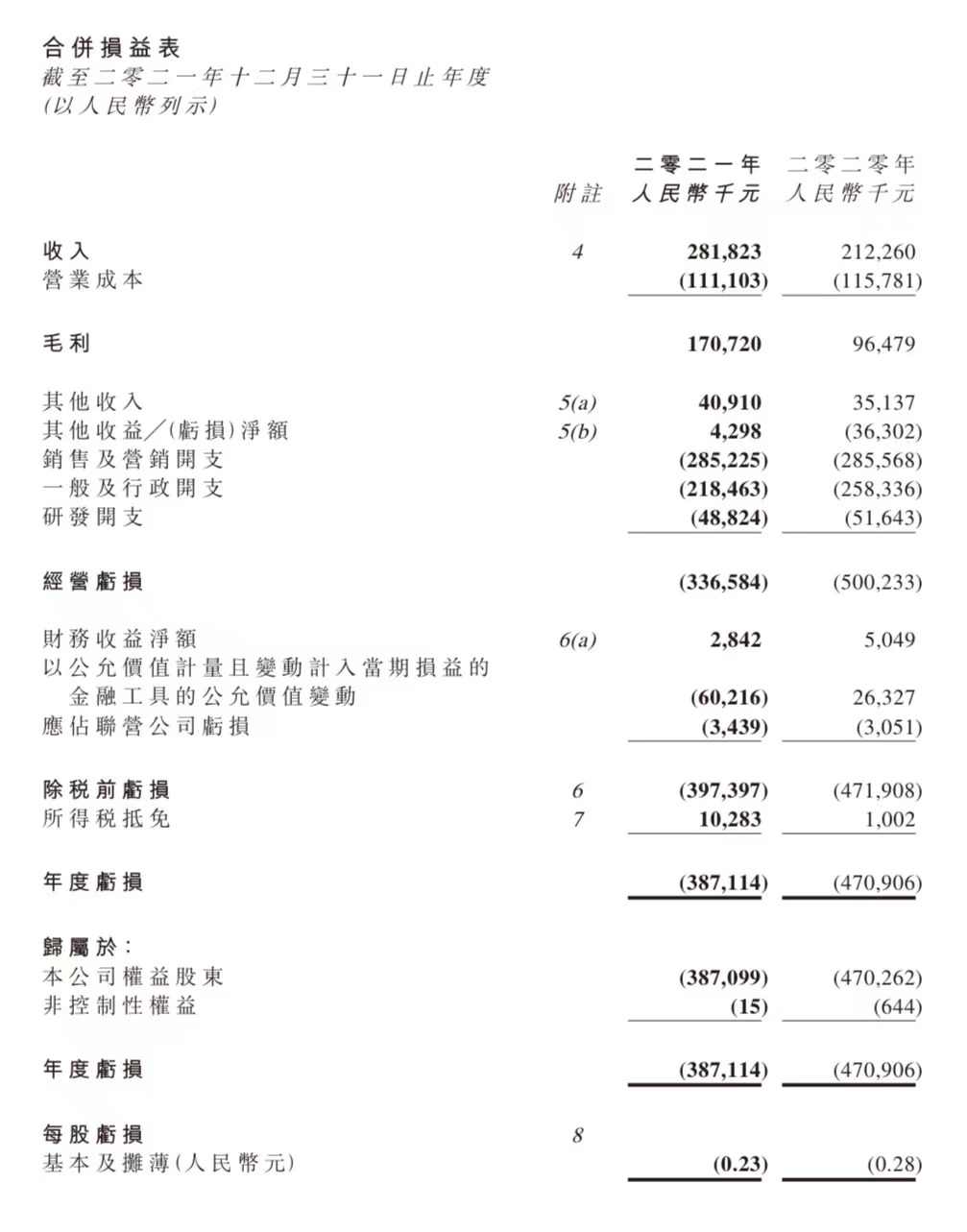 2021年,毛利為1.7億元,去年同期為9647.9萬(wàn)元,同比增長(zhǎng)77%;經(jīng)營(yíng)虧損由去年同期的5億元縮窄至3.37億元。