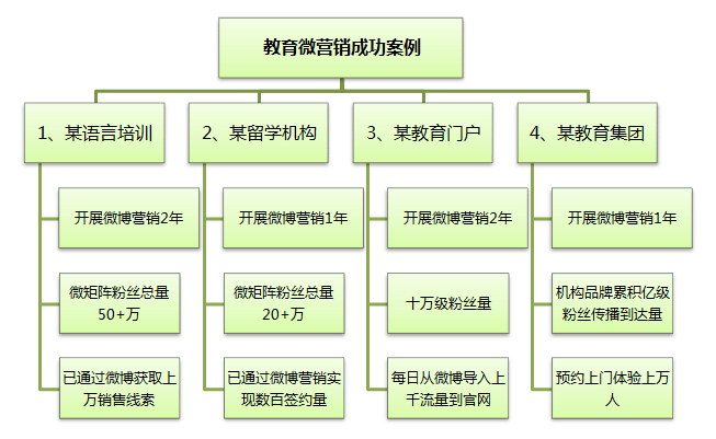 近兩年,從各類教育培訓(xùn)機構(gòu)紛紛開設(shè)官方微博、努力積累出微博數(shù)量、粉絲數(shù)量不難看出,微博營銷已成教育行業(yè)開展網(wǎng)絡(luò)招生營銷的新寵。