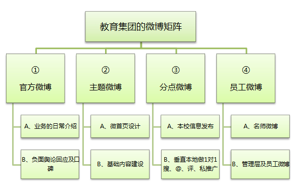 為了最終達到“品牌+銷售+口碑”的多贏效果,教育機構(gòu)微博應(yīng)一如其豐富的服務(wù)產(chǎn)品構(gòu)成一般,形成自己的微博矩陣,微矩陣可以是幾個微博構(gòu)成,也可能是幾十個幾百個微博,需要從機構(gòu)實際運營角度出發(fā)架構(gòu)。