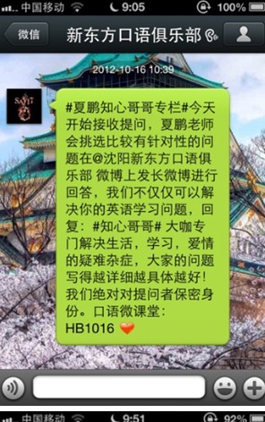 導(dǎo)語(yǔ):由于目標(biāo)用戶(hù)不精準(zhǔn),轉(zhuǎn)化難,越來(lái)越多的機(jī)構(gòu)已經(jīng)拋棄微博,投奔微信。電商界各類(lèi)關(guān)于微信的“神話(huà)”層出不窮,更給教育圈不小的動(dòng)力。玩微信,第一步是抓粉,怎么樣有效增加并黏住這些粉絲?沈陽(yáng)新東方英語(yǔ)學(xué)習(xí)部總監(jiān)覃流星投稿,詳細(xì)介紹了他們是怎么運(yùn)營(yíng)一個(gè)粉絲3萬(wàn)+的公眾號(hào)的,以下為全文: