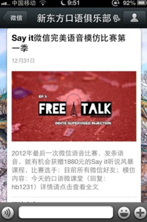 口語(yǔ)俱樂(lè)部這個(gè)公眾微信是我在2012年暑假結(jié)束后建立的,建立的原因是我覺(jué)得用微博的大學(xué)生其實(shí)沒(méi)有那么多,但是用微信的學(xué)生卻很多,官方微信到現(xiàn)在一年的時(shí)間,微信粉絲增加到了30000多人,我們每天給大家發(fā)送的各種口語(yǔ)內(nèi)容得到了學(xué)員很好的反饋,每天能收到幾千條的微信回復(fù),很好地培養(yǎng)了學(xué)員粘度。以下是我對(duì)如何做好語(yǔ)言學(xué)習(xí)類(lèi)公眾微信的分析,案例都是我們口語(yǔ)俱樂(lè)部的例子,寫(xiě)得不好的地方,請(qǐng)各位批評(píng)指正。