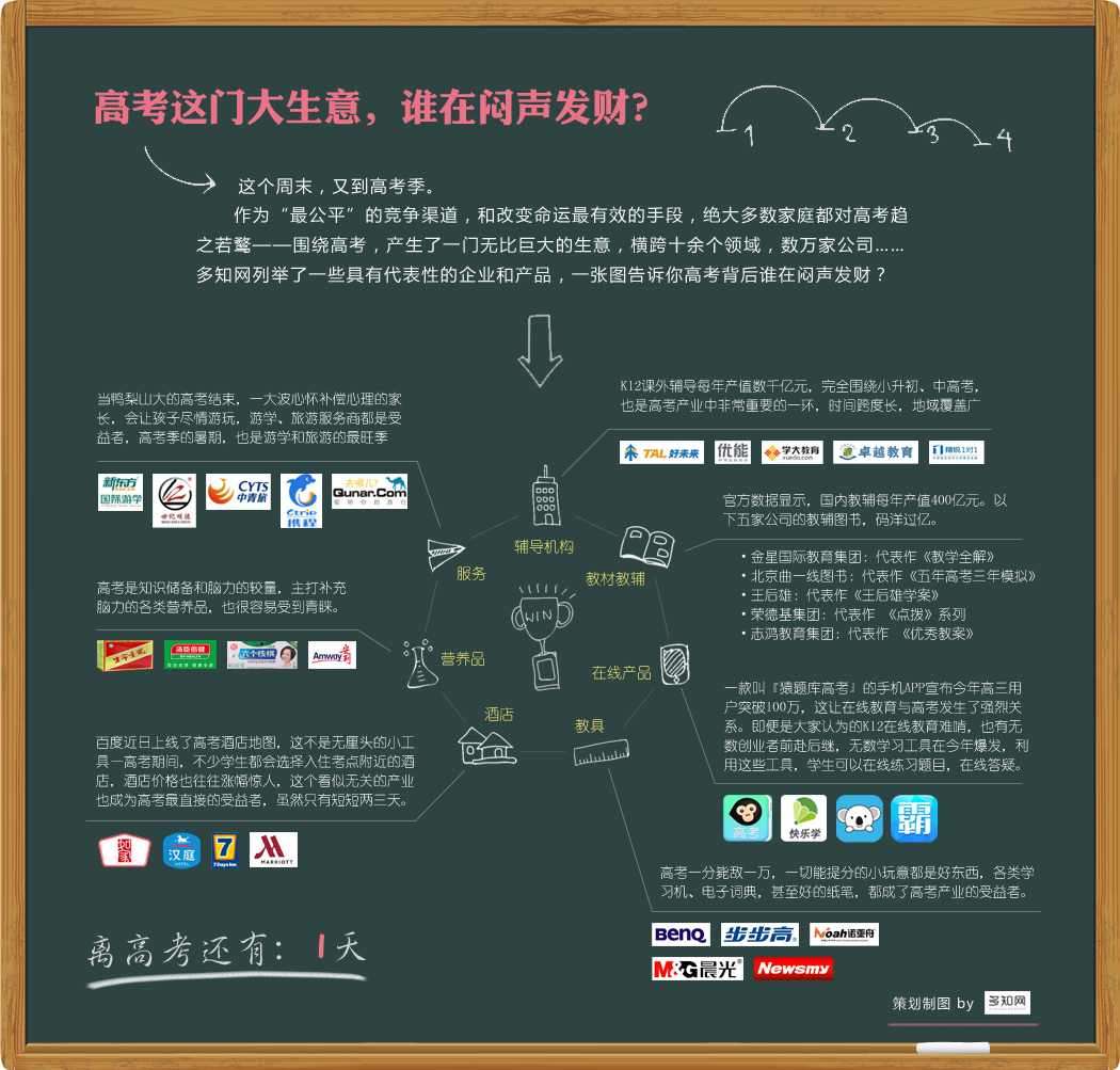 又到高考季,作為“最公平”的競(jìng)爭(zhēng)渠道,和改變命運(yùn)最有效的手段,多數(shù)家庭都對(duì)高考趨之若鶩——圍繞高考,也產(chǎn)生了一門(mén)無(wú)比巨大的生意,橫跨數(shù)十個(gè)領(lǐng)域,數(shù)萬(wàn)家公司……多知網(wǎng)選擇了一些有代表性的企業(yè)和產(chǎn)品,告訴你高考背后,誰(shuí)在悶聲發(fā)財(cái)?