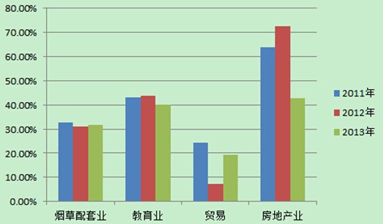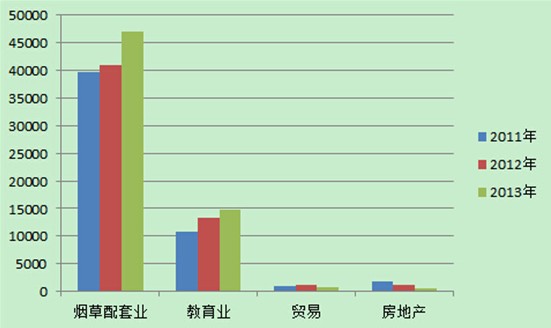 從往年財(cái)報(bào)來看,煙草配套業(yè)、教育業(yè)營收呈上漲趨勢,而貿(mào)易、房地產(chǎn)營收則在逐年下滑:2011年-2013年,煙草配套業(yè)營收分為別為3.96億、4.09億、4.7億,教育業(yè)營收分別為1.07億、1.34億、1.48億,貿(mào)易營收分別為1053萬、1130萬、832萬,房地產(chǎn)營收分別為1802萬、1086萬、483萬。
