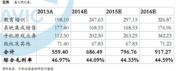 公司通過培訓(xùn)學(xué)校的模式,已經(jīng)實(shí)現(xiàn)了華南地區(qū)5個(gè)校區(qū),華中地區(qū)23個(gè)校區(qū)的規(guī)模水平,覆蓋學(xué)生群體10萬余人,課程涵蓋了面對(duì)K12群體的高中、初中、小學(xué)及特色課程(英語、寫作、數(shù)學(xué))等。2013年培訓(xùn)收入超過3000萬,是公司業(yè)務(wù)體系中增長較快且毛利率較高的業(yè)務(wù)之一。在線下資源的布局中,公司依托資金優(yōu)勢(shì)采取的是參股或并購的模式,對(duì)業(yè)務(wù)的快速擴(kuò)張起到了重要作用。