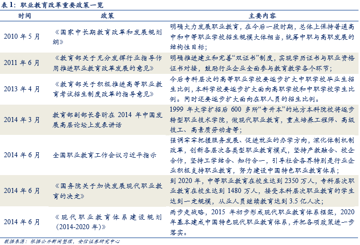 此次職業(yè)教育改革政策,有三大特點(diǎn):一是領(lǐng)導(dǎo)層的重視程度前所未有,二是改革力度 前所未有,三是部門協(xié)作程度前所未有。習(xí)主席和李總理均給予了重要指示,全國職業(yè)教育工作會(huì)議有 59 個(gè)國務(wù)院部門和 9 個(gè)行業(yè)組織參會(huì),各方將協(xié)調(diào)推進(jìn)職業(yè)教育改革,我國職業(yè)教育正迎來史無前例的發(fā)展機(jī)遇。