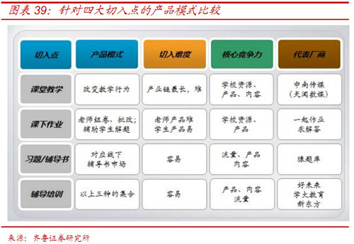培訓(xùn)輔導(dǎo):課外輔導(dǎo)機(jī)構(gòu)或者家教 1:1 等輔導(dǎo)產(chǎn)品的目的就是為學(xué)生提供額外的教學(xué),幫助學(xué)生提高。而隨著大數(shù)據(jù)時(shí)代的到來,定位學(xué)生的薄弱環(huán)節(jié),變得容易。而定位學(xué)生薄弱環(huán)節(jié)主要通過輔導(dǎo)學(xué)生解題和提供習(xí)題庫的過程中產(chǎn)生,因此目前輔導(dǎo)機(jī)構(gòu)亦在通過題庫、解答作業(yè)等產(chǎn)品形態(tài)去切入市場。此外,輔導(dǎo)機(jī)構(gòu)的教學(xué)過程正在向數(shù)字化和在線化方向改變。此產(chǎn)品模式的領(lǐng)先廠商分別為好未來、學(xué)大教育和新東方。