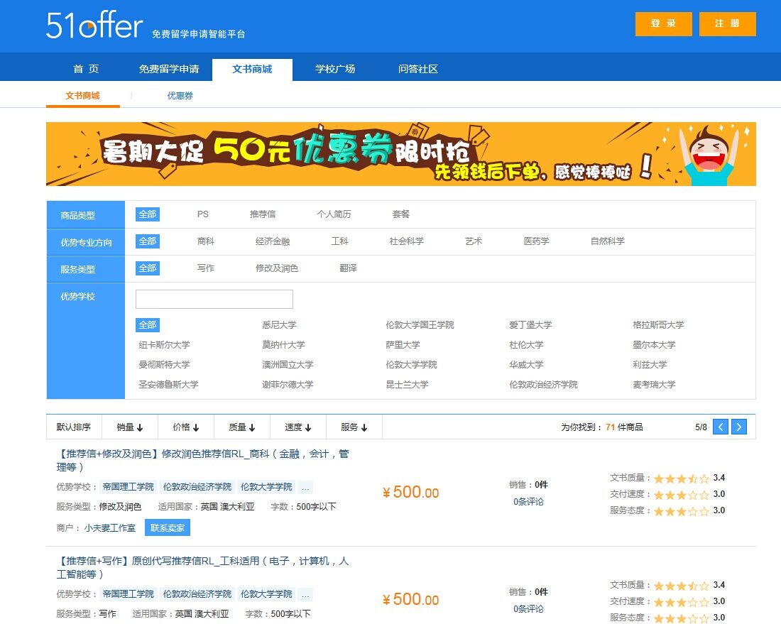 多知網(wǎng)8月8日消息,自助留學(xué)申請平臺51offer推出文書商城,文書商城的性質(zhì)和淘寶商城類似,有不同的商戶,提供的服務(wù)涵蓋個人簡歷翻譯到制作全套申請文案,售價(jià)在60-2600元不等。