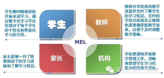 從下圖可以看出,Big English的大數(shù)據(jù)分析系統(tǒng)以學(xué)生為中心,按照教、學(xué)、測(cè)三個(gè)環(huán)節(jié)組織線(xiàn)上學(xué)習(xí)內(nèi)容與學(xué)習(xí)過(guò)程,將學(xué)生、教師、家長(zhǎng)、機(jī)構(gòu)四類(lèi)用戶(hù)群有機(jī)整合在MEL學(xué)習(xí)管理系統(tǒng)中,各司其責(zé),相互作用,實(shí)現(xiàn)了個(gè)性化的課堂教學(xué)、家庭輔導(dǎo)和自主學(xué)習(xí)管理環(huán)境。