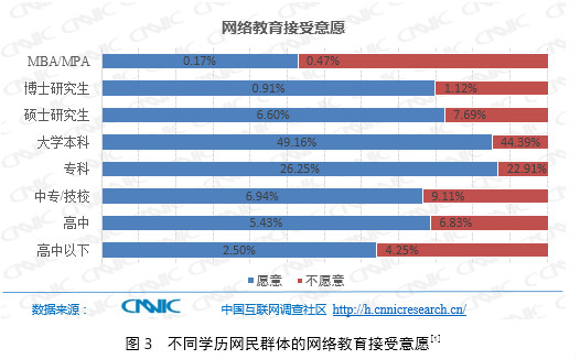 圖3顯示,高學(xué)歷者接受網(wǎng)絡(luò)教育的意愿很低。MBAMPA、博士研究生愿意接受網(wǎng)絡(luò)教育的人群占比不足1%;碩士研究生中,不愿意接受網(wǎng)絡(luò)教育的人群占比較高。學(xué)歷飽和、時間少、課業(yè)負擔(dān)重等因素降低高學(xué)歷群體的再教育需求。另一方面,高中及高中以下網(wǎng)民中不愿意接受網(wǎng)絡(luò)教育的占比較高,這一群體承擔(dān)著在讀課業(yè)、輔導(dǎo)班、特長班及其他壓力。