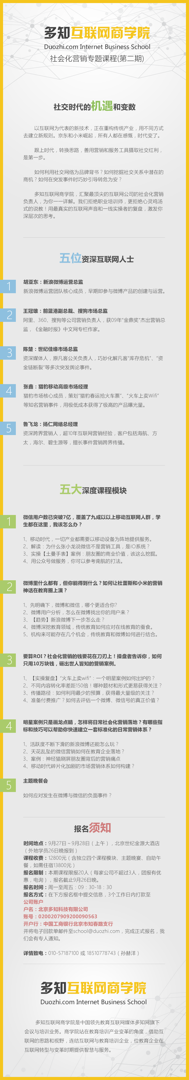 多知商學(xué)院社會化營銷專題課程,匯聚互聯(lián)網(wǎng)行業(yè)最頂尖的企業(yè)中的高管,拒絕非實操經(jīng)驗的職業(yè)培訓(xùn)師和心靈雞湯式說教方式,真正通過當(dāng)事人總結(jié)互聯(lián)網(wǎng)最成功案例的管理實踐,用真實的互聯(lián)網(wǎng)聲音,開拓視野和激發(fā)深層次的思考。幫助企業(yè)在一片混亂的互聯(lián)網(wǎng)思維中真正理清方向,將變化轉(zhuǎn)變?yōu)闄C遇。