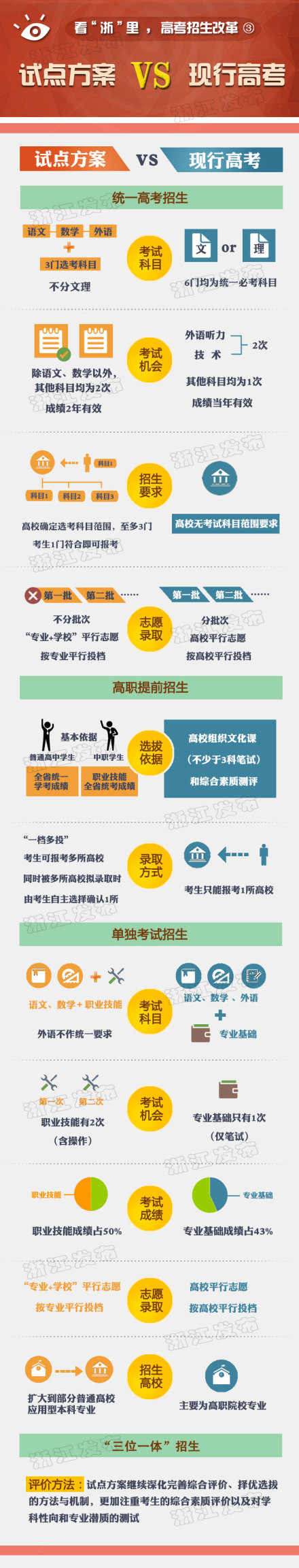 浙江高考改革方案主要內(nèi)容包括:不分文理,語文、數(shù)學、外語+3門選考科目;外語和選考有兩次考試機會,成績兩年有效;高校確定選考科目范圍,至多3門,考生1門符合即可報考;語數(shù)外每門150分,選考科目分等級打分,每門最高100分,總分750分;取消一二本等批次區(qū)別;2014級高一開始實施。