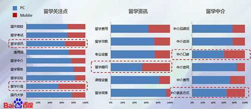 另外,留學(xué)資訊、留學(xué)價(jià)值、留學(xué)疑問(wèn)類檢索及各種口碑類的檢索在無(wú)線端更加顯著。