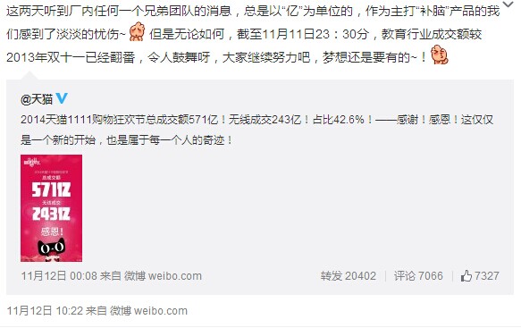 據(jù)淘寶同學官方微博透露,截至11月11日23:30分,教育行業(yè)成交額也較2013年雙十一翻番。但是并未透露具體的銷售數(shù)據(jù)。