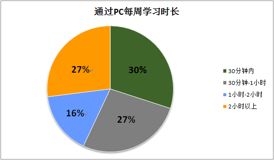 報告顯示,6成用戶每周在線學習時間不足1小時。在PC端,30%的用戶每周在線學習時長在半小時以內(nèi),27%的用戶周在線學習時長超過2小時,在線學習時長呈現(xiàn)“兩極化”;在移動端,41%的用戶每周在線學習時長不到半小時,12%的用戶每周少于10分鐘,22%的用戶每周學習半小時-1小時,37%的用戶每周學習時長超1個小時。