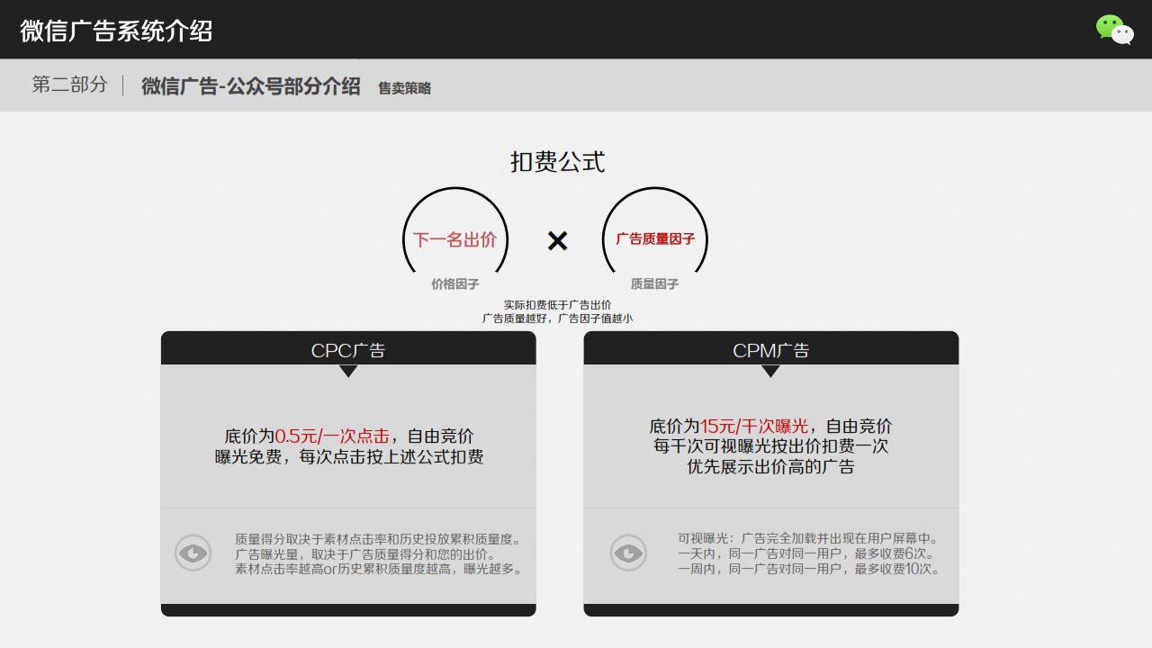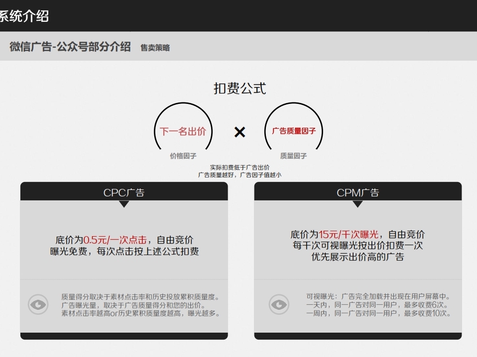 昨日,微信正式內(nèi)測朋友圈廣告。今天,一套關(guān)于微信朋友圈廣告系統(tǒng)的詳細(xì)介紹的PPT流傳開來。在這套PPT里,騰訊介紹了目前微信用戶數(shù),微信朋友圈中的廣告形態(tài),收費(fèi)方式,曝光策略,扣費(fèi)策略,售賣策略。