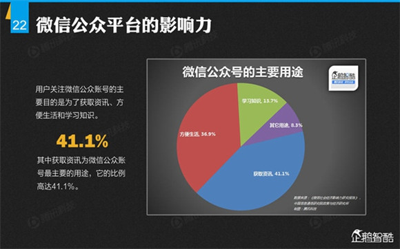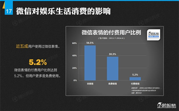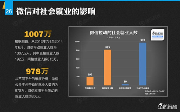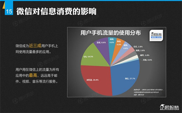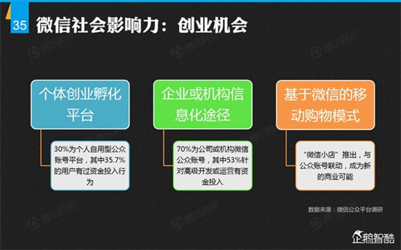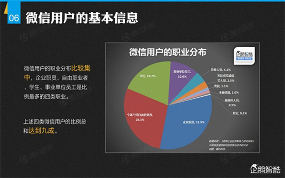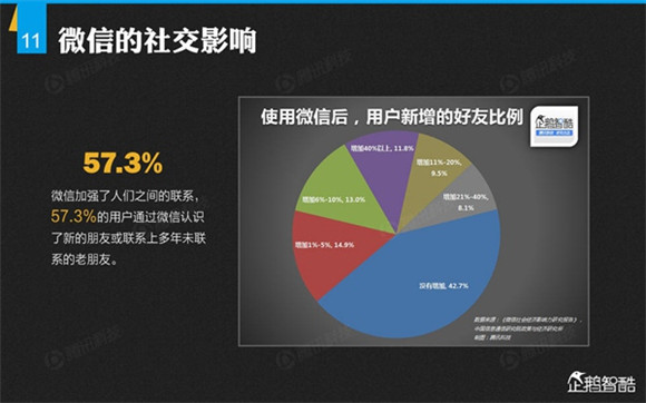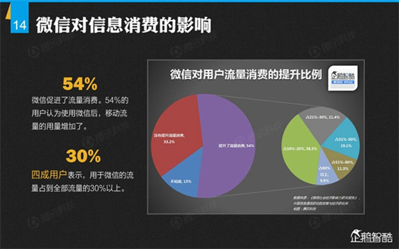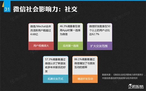微信誕生4年后,騰訊出品了首份微信平臺(tái)數(shù)據(jù)化報(bào)告,就微信用戶的基本信息、微信的社交影響、微信對(duì)信息消費(fèi)的影響、微信對(duì)娛樂和生活消費(fèi)的影響、微信公眾平臺(tái)的影響力、微信對(duì)社會(huì)就業(yè)的影響、微信對(duì)社會(huì)公益的影響、其整體影響力等方面做了調(diào)查研究。