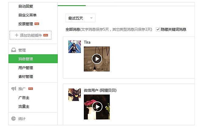 目前,此項功能僅限于認證過的微信公眾號。微信公眾號可以接受來自微信用戶的小視頻,保存到素材庫里。之后,公眾號可以將小視頻插入圖文消息中,并下發(fā)給微信用戶。下發(fā)渠道包括群發(fā)消息、自定義回復、自動回復等。
