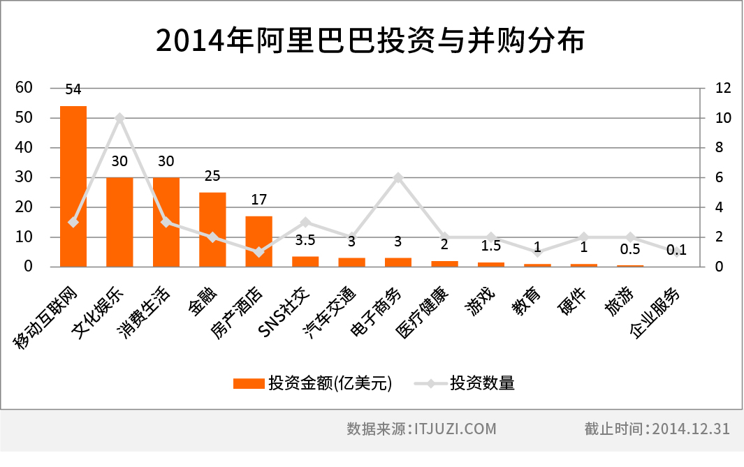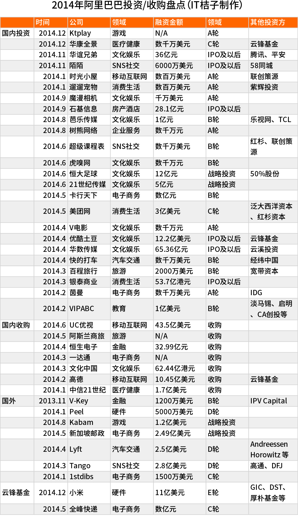 從IT桔子數(shù)據(jù)庫來看,2014年阿里巴巴在投資和收購上特別活躍,先后進(jìn)行了超過40起的投資、而且一半以上的投資都是大手筆,超過了上億元人民幣,粗略計(jì)算阿里巴巴2014年的投資金額超過170億美元。