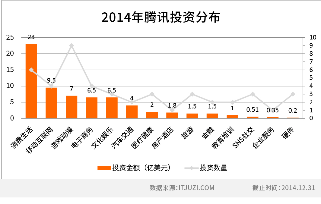 IT桔子數(shù)據(jù)庫中,2014年騰訊所投資或收購的公司超過46起,根據(jù)公開金額的投資粗略估算達(dá)到70億美元。
