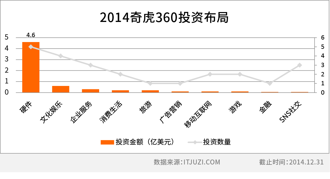 來自IT桔子的數(shù)據(jù)庫顯示,2014年奇虎360的投資和收購有24起,從所披露的投資金額估算年度投資額近7億美元,主要集中在企業(yè)(安全)、 硬件、文化娛樂、移動(dòng)互聯(lián)網(wǎng)等方向,資金分布上也基本上一致。和其他幾家公司不一樣的是,奇虎360在2014年的投資案例中有4起是作為公司IPO前的基石投資者來入股的,不知道是基于戰(zhàn)略合作、還是財(cái)務(wù)投資。