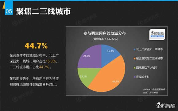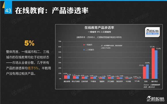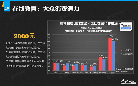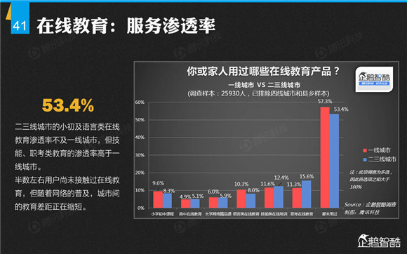 今日,騰訊科技企鵝智庫發(fā)布2015年中國二三線城市互聯(lián)網(wǎng)跨界報告,報告顯示,中國二三線城市半數(shù)左右作用用戶尚未接觸過在線教育,但是隨著網(wǎng)絡普及,城市之間教育差距正在縮短。