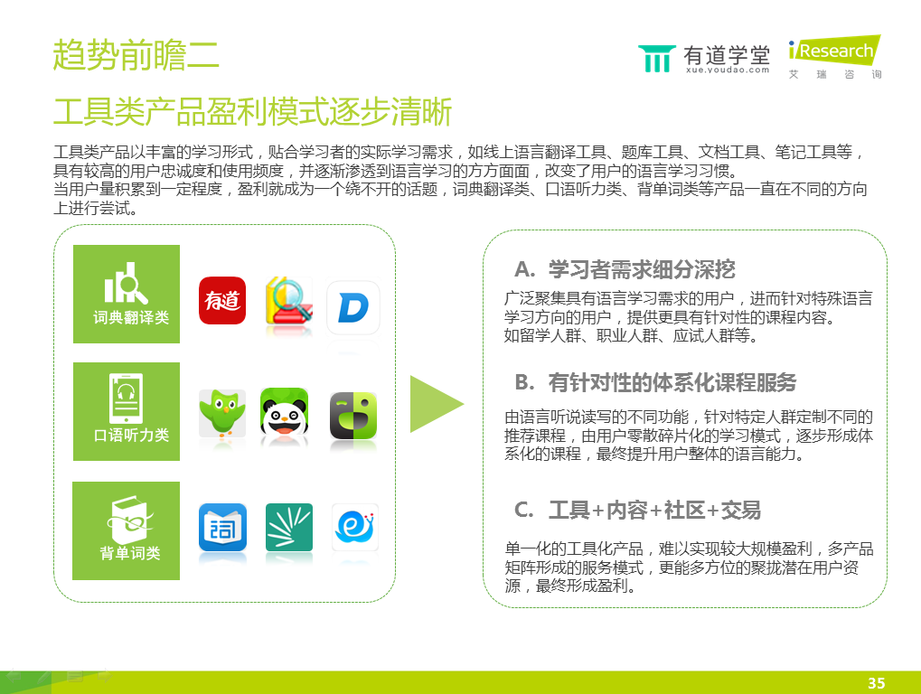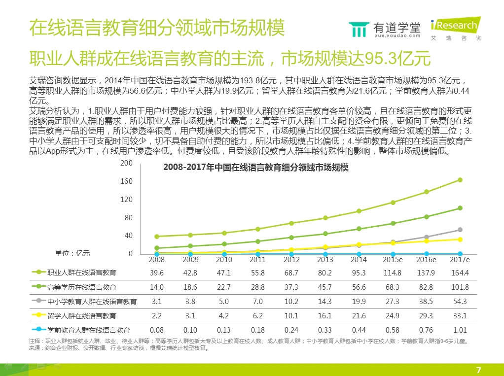 今日,網(wǎng)易有道學(xué)堂與艾瑞咨詢聯(lián)合發(fā)布了一份在線教育語言培訓(xùn)報告,涵蓋了行業(yè)發(fā)展?fàn)顩r、用戶行為觀察、產(chǎn)品分析、未來發(fā)展趨勢等方面。以下為報告部分內(nèi)容: