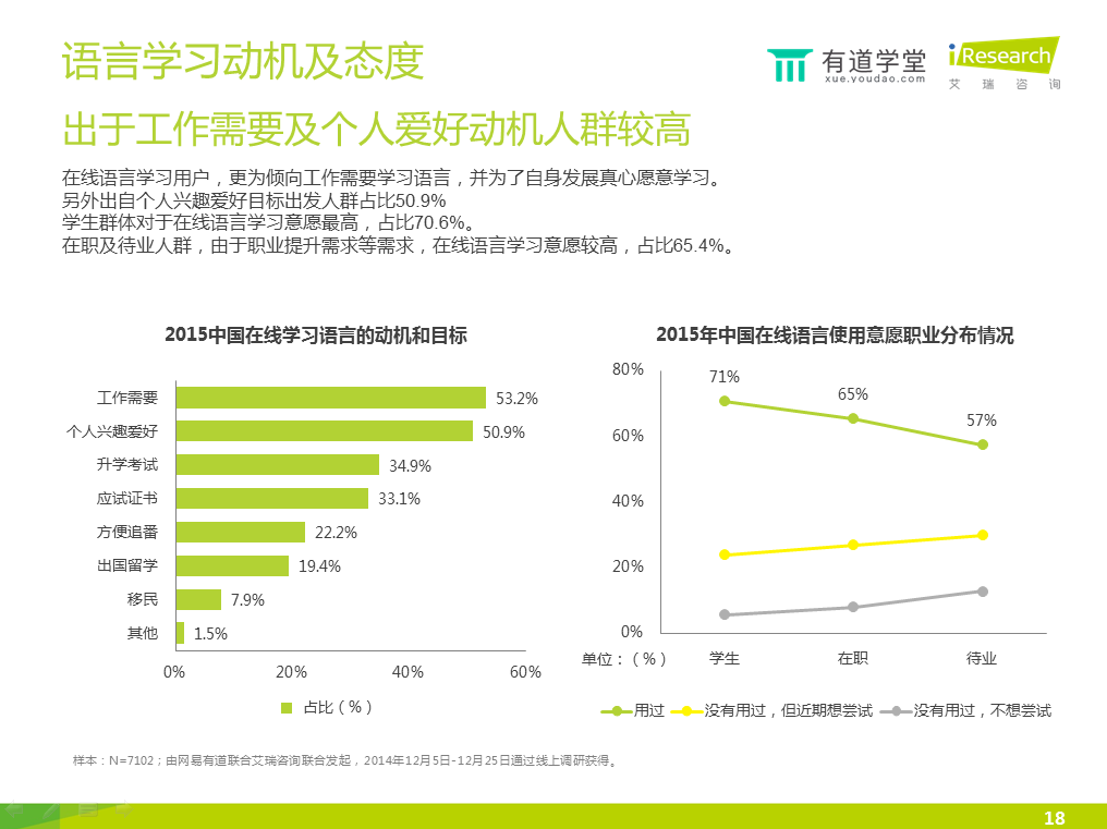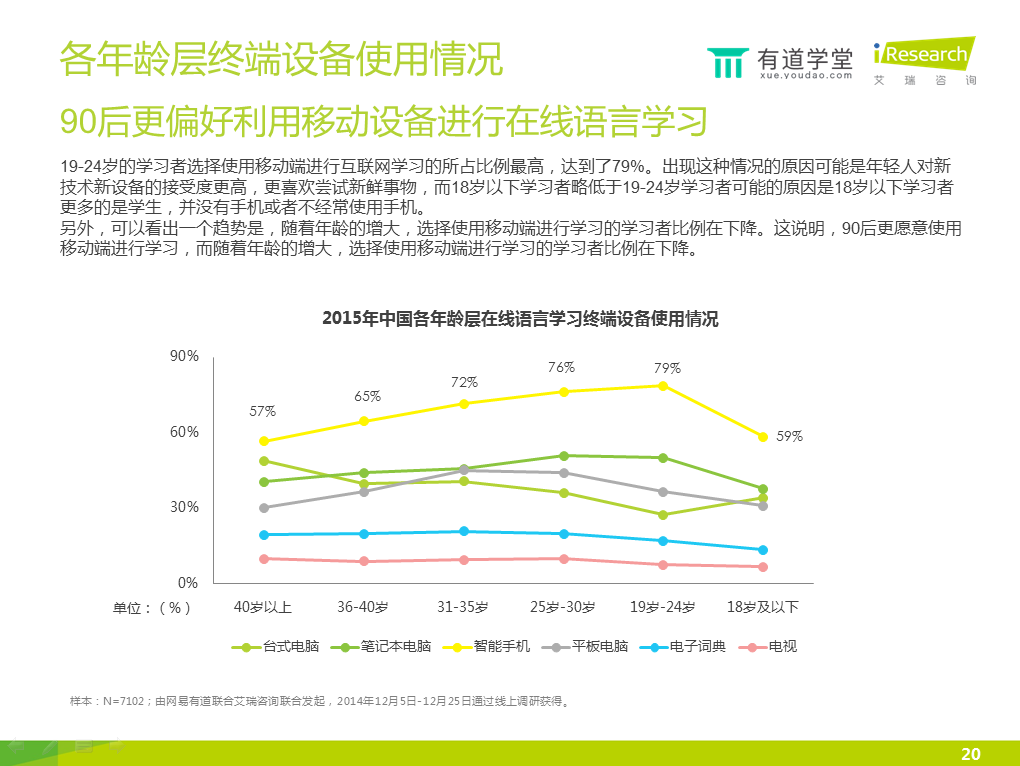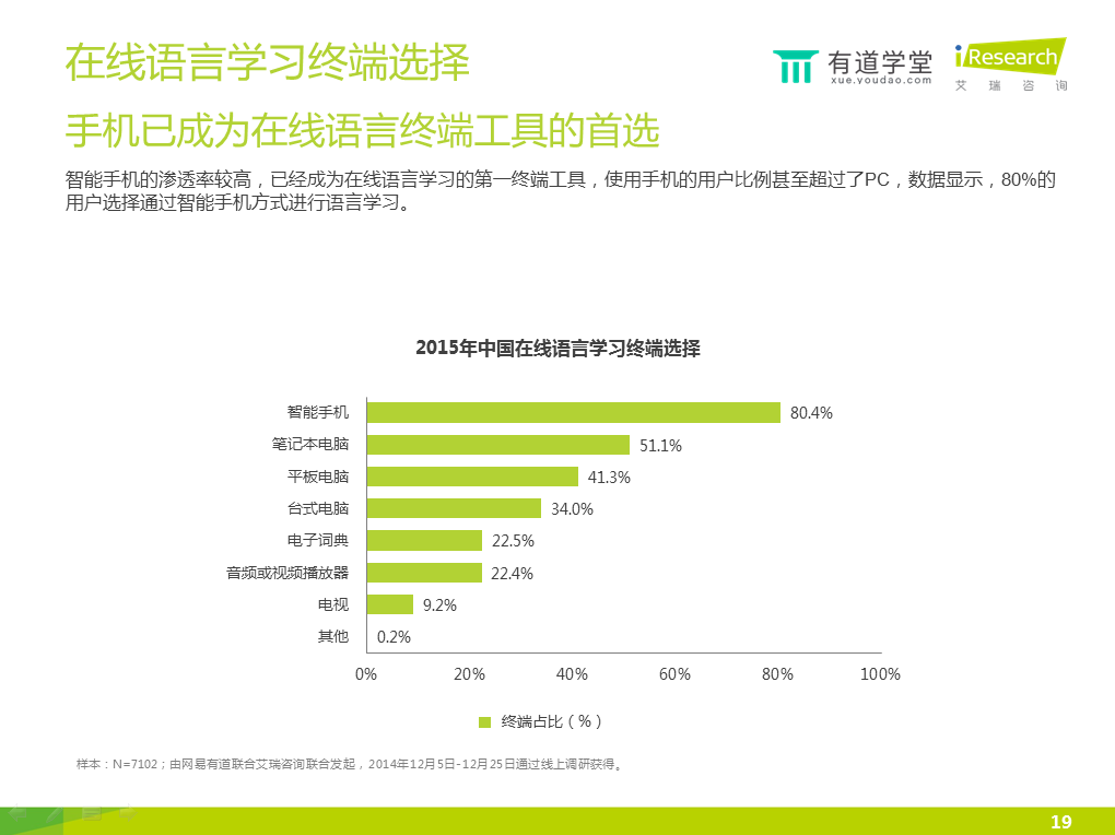 6)智能手機的滲透率較高,已經(jīng)成為在線語言學(xué)習(xí)的第一終端工具。