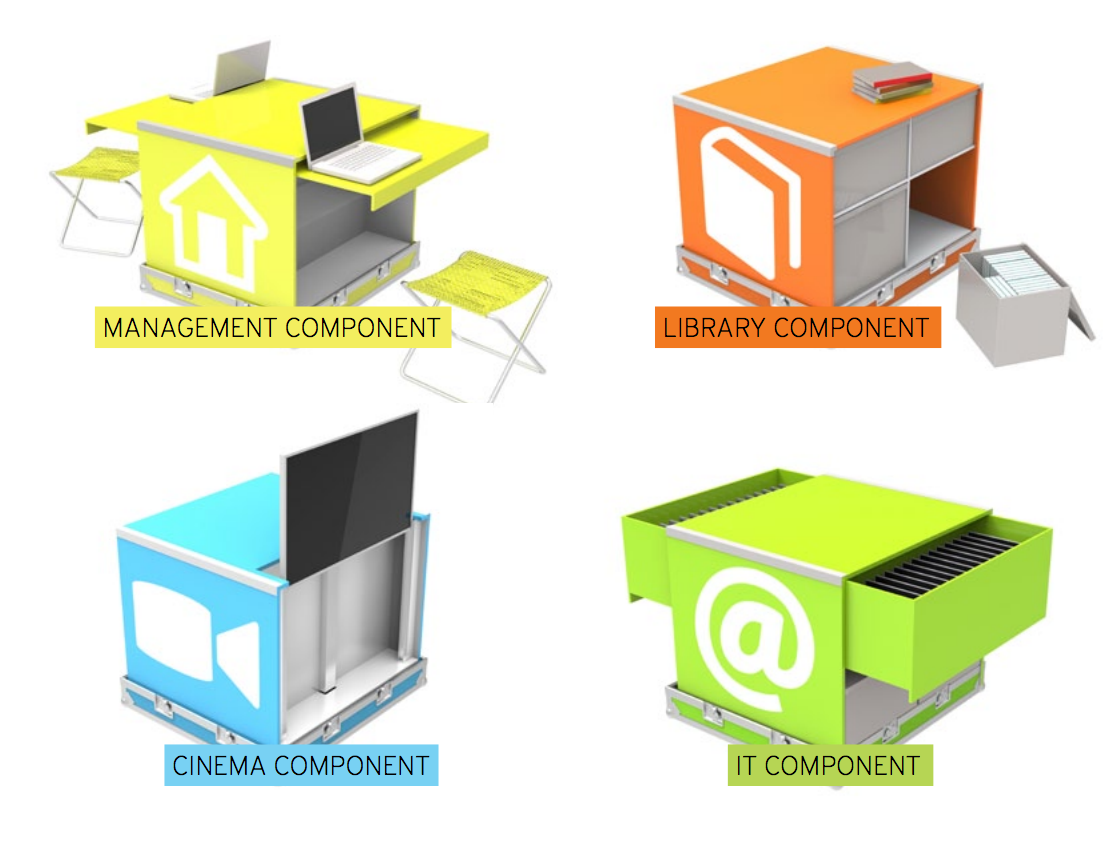 Ideas Box是一個來自巴黎的創(chuàng)業(yè)項目,主要產(chǎn)品就是四個彩色的盒子,里面裝著各種教學(xué)用具和網(wǎng)絡(luò)和獨(dú)立電源。教學(xué)用具包括:衛(wèi)星網(wǎng)絡(luò)連接器,15 個平板電腦,4 個筆記本電腦,5 個高清攝像機(jī),50 個預(yù)裝 5000 本電子書的閱讀器,25 本實(shí)體書,離線 MOOC 課程,TED 視頻,預(yù)裝 100 部紀(jì)錄片、動畫片的電視和手工課需要的道具等,可以在 20 分鐘以內(nèi)組裝一個小型教室。
